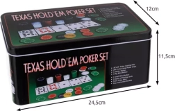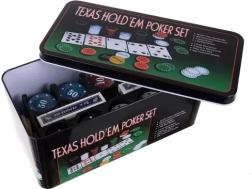 Completo set de póker TEXAS HOLD’EM en una práctica caja metálica que incluye 200 fichas con diferentes denominaciones, 2 barajas de cartas, un juego de fichas funcionales (Dealer, Small Blind, Big Blind) y una alfombrilla de juego verde. Todo está ordenado en un soporte para fichas, que garantiza el orden y facilita el transporte.