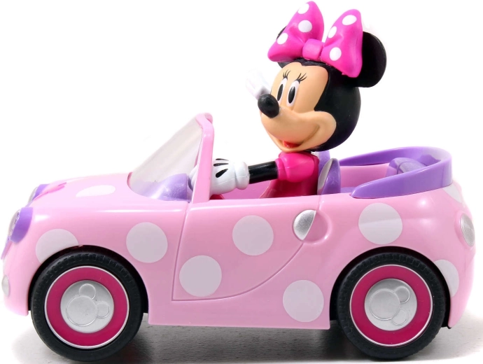 El cabrio rosa con lunares y la figura fija de MINNIE MOUSE estimula la imaginación y el juego temático.