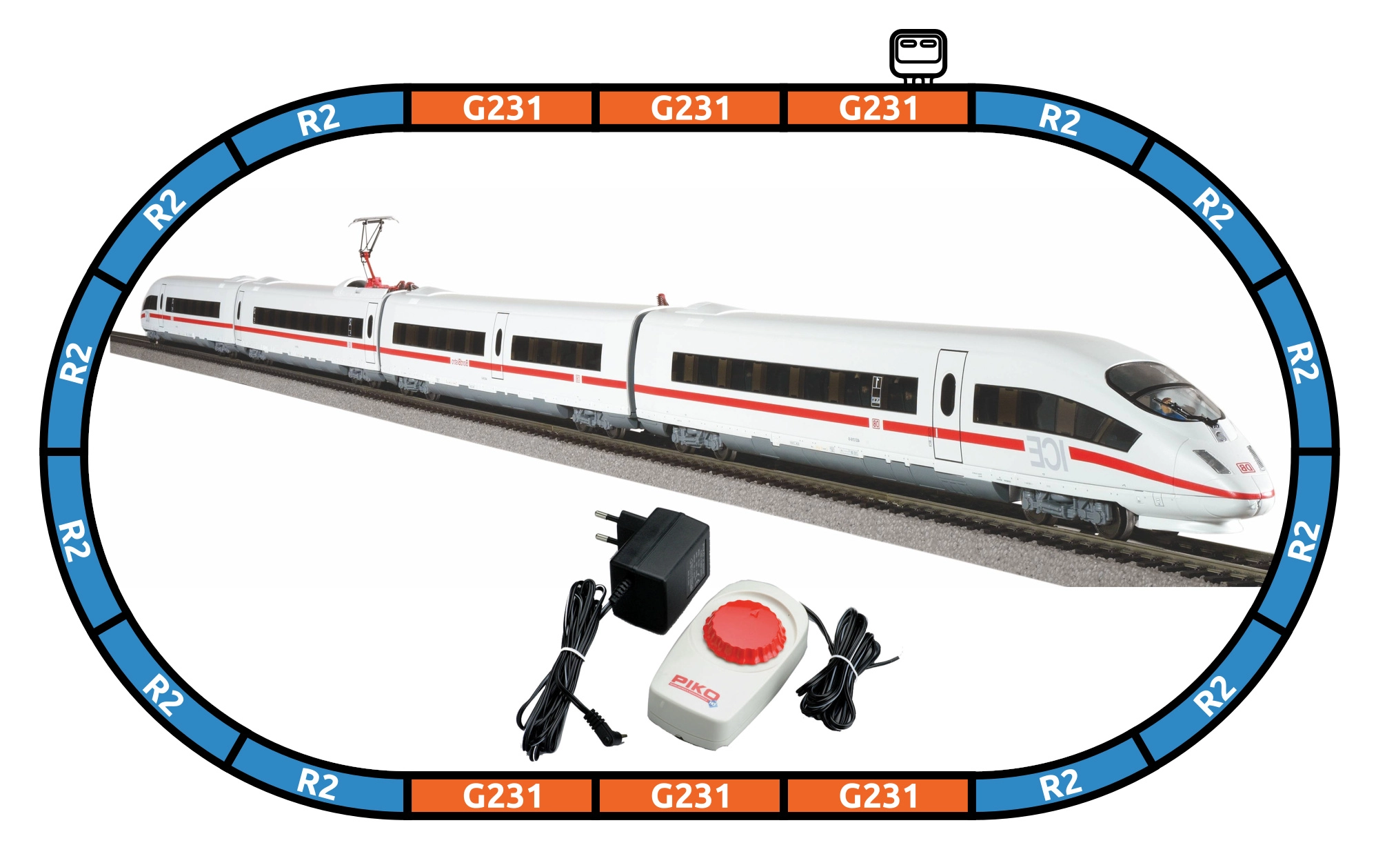 - Conjunto ICE 3 DB AG de 4 piezas (1 ud), vías curvas R2 con balasto 55412 (12 uds), rectas G231 con balasto 55401 (5 uds), recta G231 con alimentación 55406 (1 ud), base para pinza 55447 (1 ud), pinza de alimentación 55270 (1 ud), controlador analógico con fuente 55003 (1 ud)