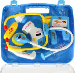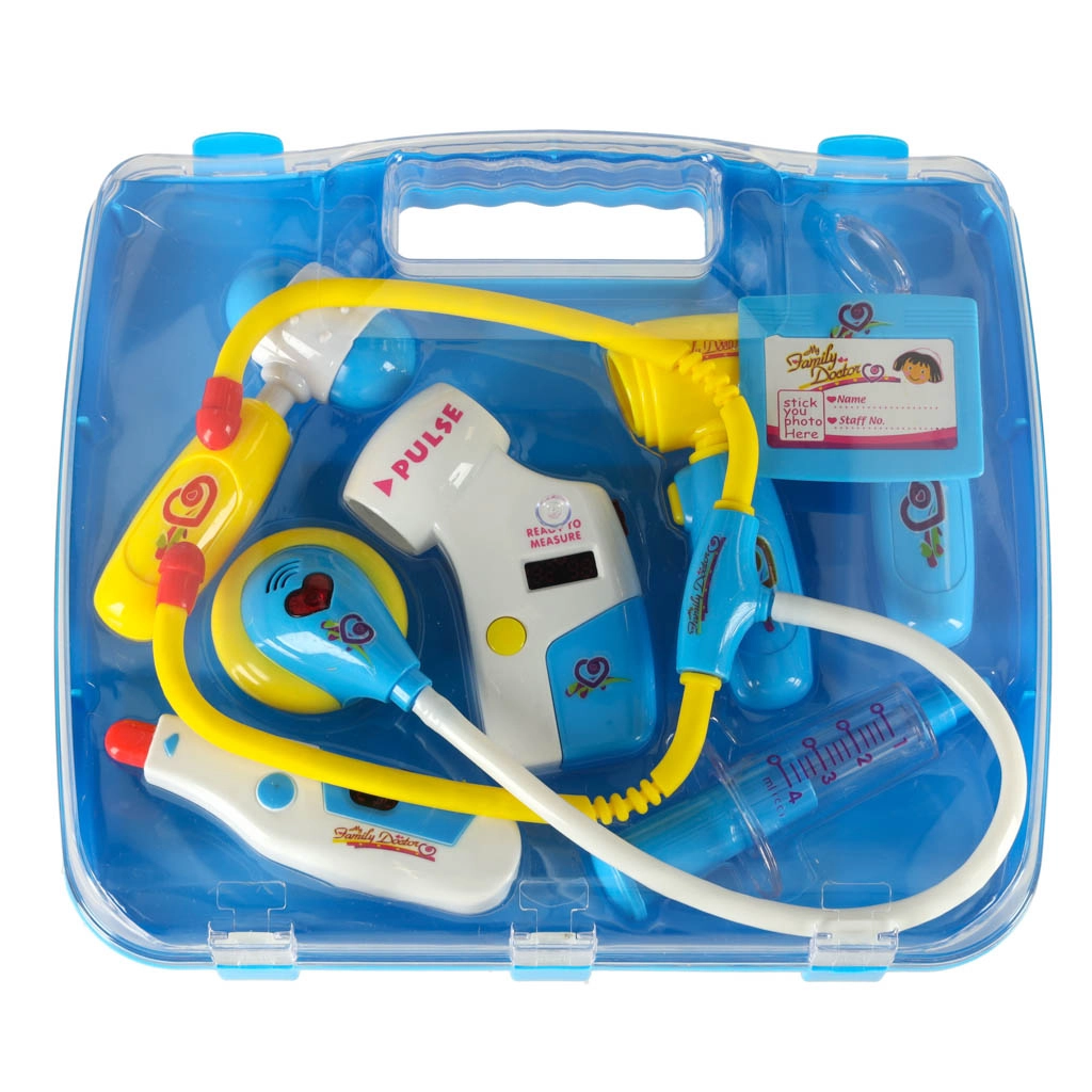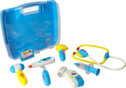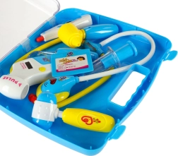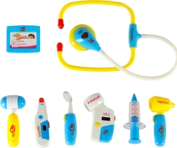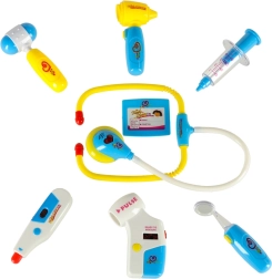 El set incluye herramientas médicas como estetoscopio, termómetro, tensiómetro, otoscopio, jeringa, martillo, insignia de médico y herramienta para revisar la garganta con iluminación.
