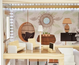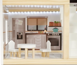 La casa LULILO FLORO en un delicado estilo boho combina aspecto natural, detalles elegantes y elementos funcionales para pequeños narradores. A los niños les encantarán las cuatro estancias amuebladas —cocina, baño, sala de estar y dormitorio— y la amplia terraza con tumbona y sombrilla. La iluminación LED integrada realza la atmósfera de juego tanto de día como de noche.