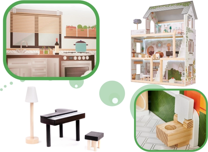 Descubre el mundo boho encantador con la casa de muñecas de madera LULILO FLORO de 78 cm de altura. La estructura de tres niveles con terraza, accesorios detallados y iluminación LED crea un ambiente acogedor para horas de juego creativo e imaginativo. La madera finamente lijada, los colores pastel y el amplio equipamiento la convierten en una preciosa decoración para el dormitorio infantil y en un regalo perfecto.