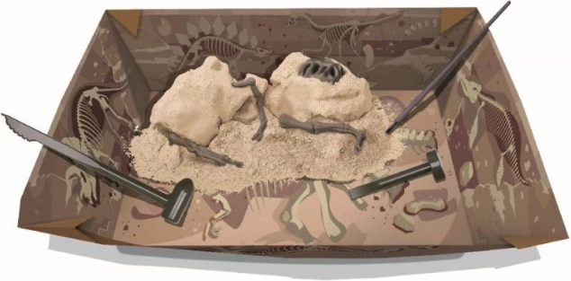 Los niños van revelando gradualmente los fósiles ocultos en el bloque de yeso y aprenden paciencia y los procedimientos correctos de excavación. Una experiencia realista de trabajo de campo en casa.