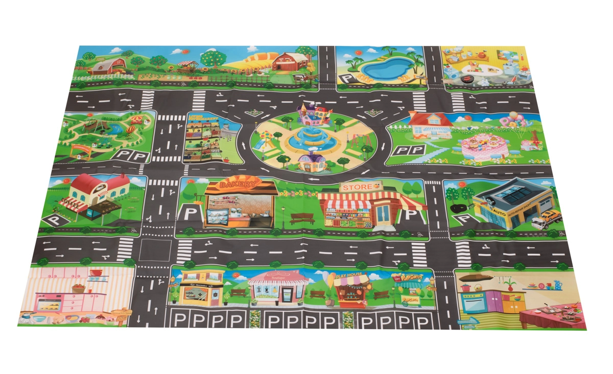 La alfombra representa un paisaje urbano con carreteras, edificios y parques, fomentando la imaginación y creatividad de los niños al jugar con sus juguetes.
