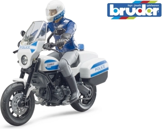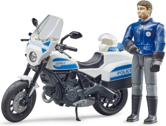 La moto policial DUCATI Scrambler de Bruder es un modelo detallado para pequeños y grandes aficionados a los servicios de emergencia. La motocicleta tiene manillar giratorio para maniobrar con facilidad y caballete abatible para un estacionamiento estable. La figura del policía tiene extremidades móviles, por lo que puede colocarse en posición de conducción o de pie junto a la máquina.