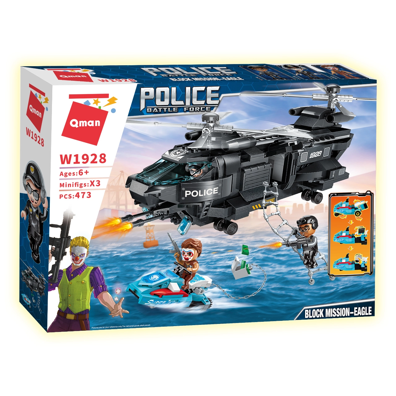 Embárcate en una emocionante misión con el set de construcción policial de Qman, protagonizado por un robusto helicóptero y una persecución sobre el agua. El set incluye 473 piezas y 3 minifiguras, ofrece hélices giratorias, la posibilidad de reconvertir la moto en una moto acuática y es compatible con otros sets. Fabricado en plástico ABS resistente y no tóxico para una diversión duradera.