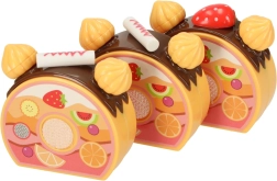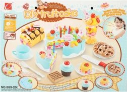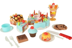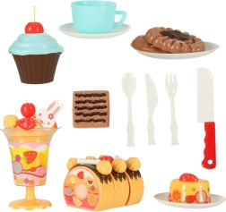 - Contenido del set (75 piezas): 6× porción de tarta, 5× vela, 14× merengue, 7× bastón de caramelo, 4× cereza, 4× mandarina, 3× fresa, 3× kiwi, 4× conejito, 1× letrero, 3× platito, 3× galleta, 3× porción de brazo de gitano, 3× cupcake, 1× taza, 1× cucharita, 1× tenedor, 1× cuchillito, 1× pala para tarta, 1× copa para helado, set de pegatinas, set de velcros.