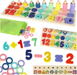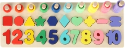 Este set Montessori combina la diversión de encajar con el aprendizaje. Los niños colocan los formas geométricas y los números de madera en los orificios correctos y, al mismo tiempo, enhebran aros de colores en las clavijas, cuyo número corresponde a la cifra indicada. Gracias a la base de madera clara y ordenada, el aprendizaje es natural y divertido.