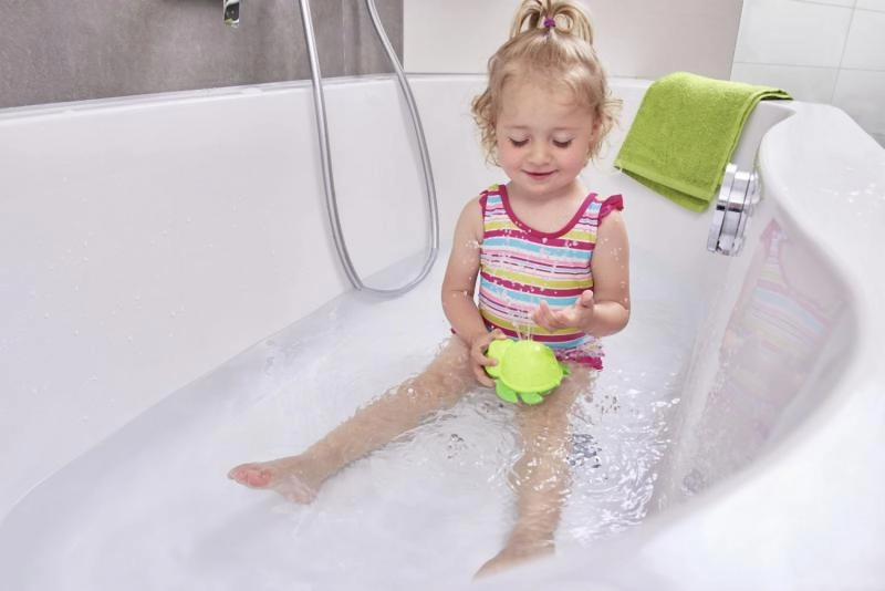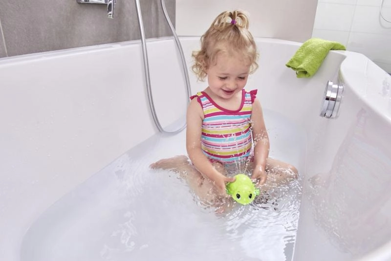 La tortuguita se desliza por la superficie y rocía suavemente agua, ideal para baños divertidos y primeros juegos acuáticos.