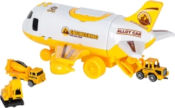 Incluye tres vehículos de construcción amarillos: excavadora con brazo móvil, hormigonera y bulldozer, además de 7 señales de tráfico. Todo cabe dentro del avión. El juguete tiene alas desmontables para ahorrar espacio y un asa para facilitar el transporte.