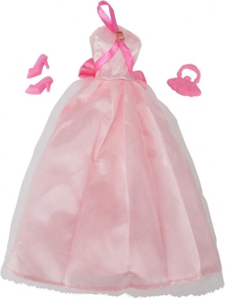 El vestido incluye tacones a juego y un bolso que complementan este conjunto elegante para muñecas.