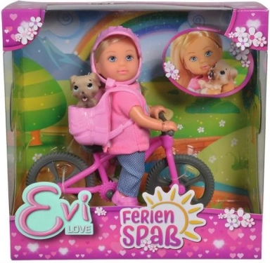 Descubre un mundo de divertidas aventuras con la muñeca Evi, que sale a pasear con su perrito. Gracias al práctico casco y a la colorida bicicleta, está preparada para un juego seguro y alegre. Su tamaño compacto de 12 cm se adapta a las manitas infantiles e invita al juego creativo en casa y de viaje.