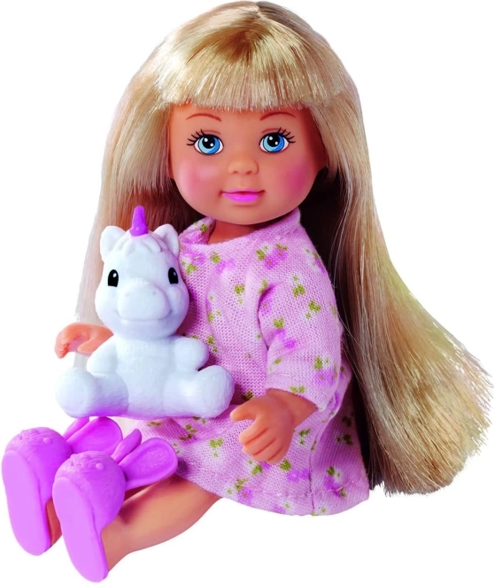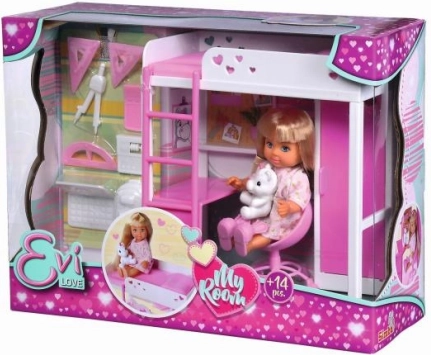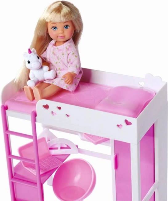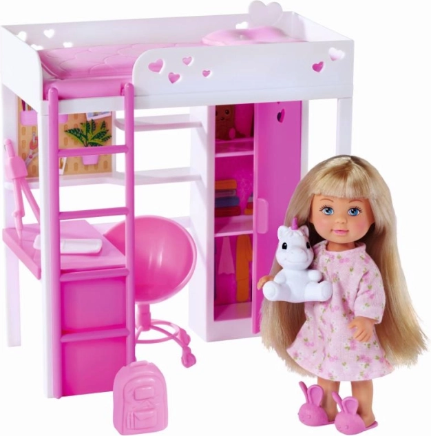 - Muñeca Evi (aprox. 12 cm), cama alta con escalera, escritorio, silla, mochila, portátil, accesorios escolares, figura de unicornio y otros accesorios (en total 14 piezas)