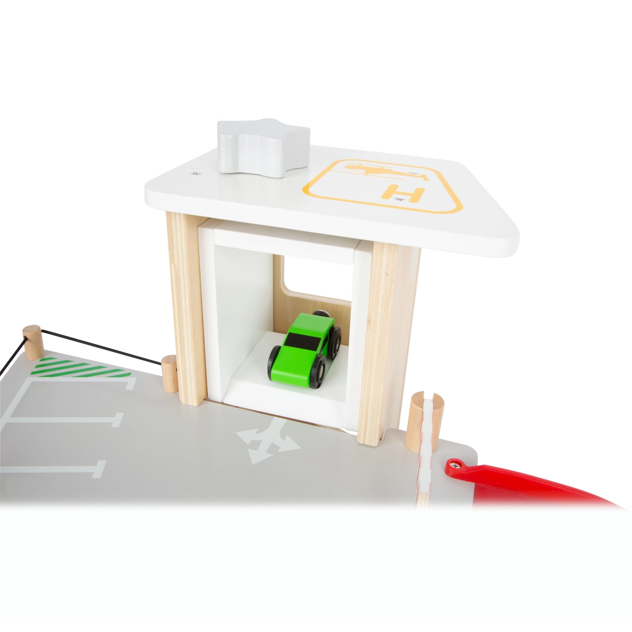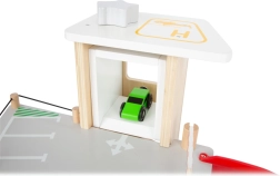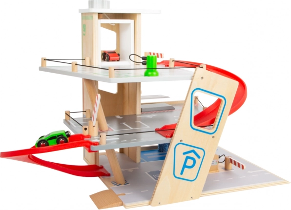Descubra un robusto aparcamiento de madera con tres plantas, ascensor funcional y rampas fluidas para juegos interminables con coches. Incluye dos coches, estación de servicio, cargador para coches eléctricos, plataforma elevadora, lavadero de coches con cepillos y barreras mecánicas en cada planta. La conducción segura está garantizada por el vallado de goma y la señalización detallada fomenta la educación vial.