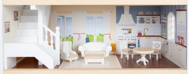 La casa de muñecas tiene una fachada exterior clara, diseño moderno y elementos funcionales como puertas correderas y ventanas abatibles.