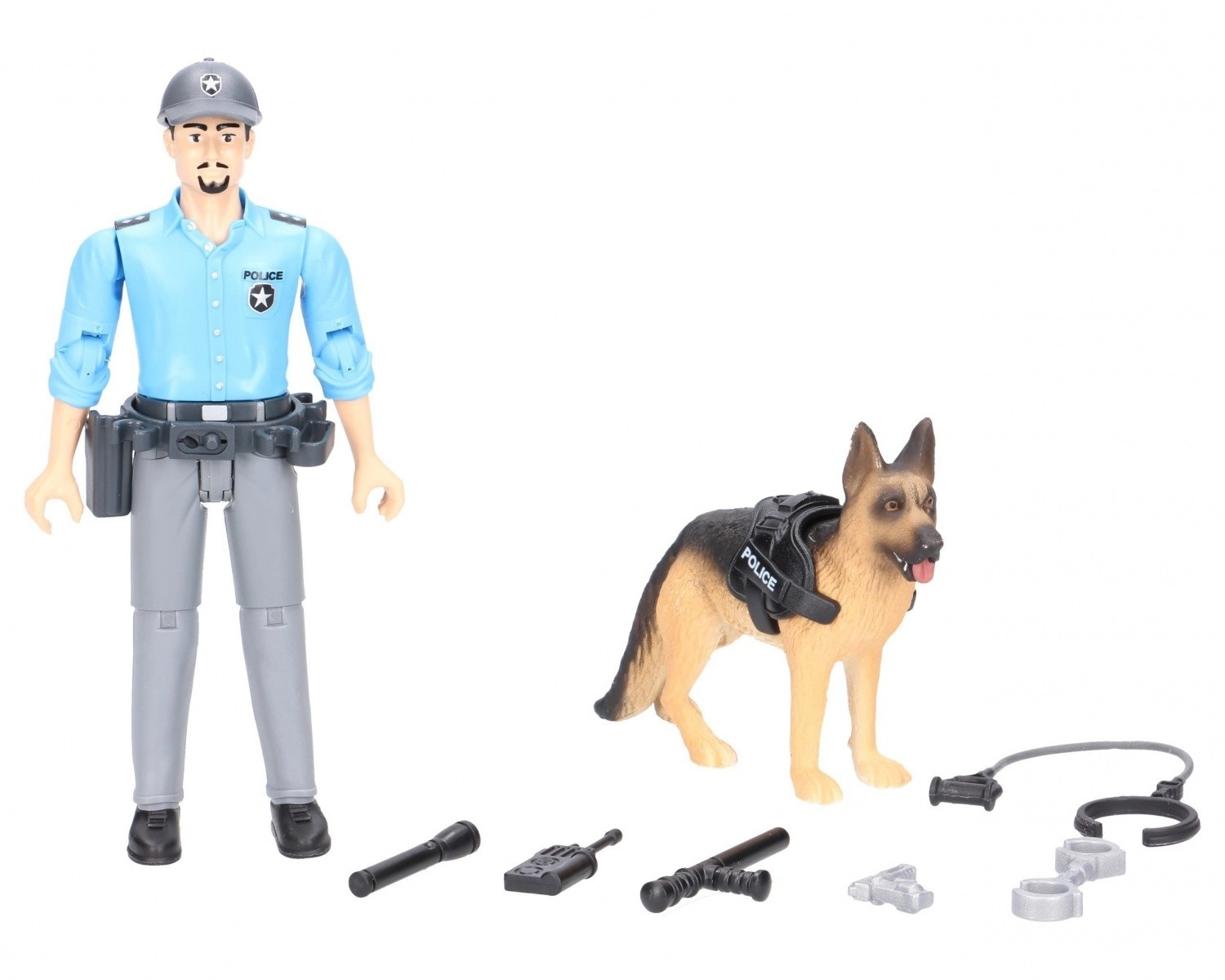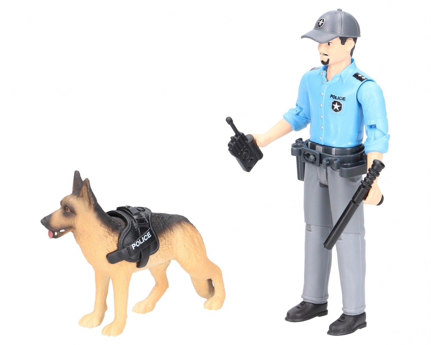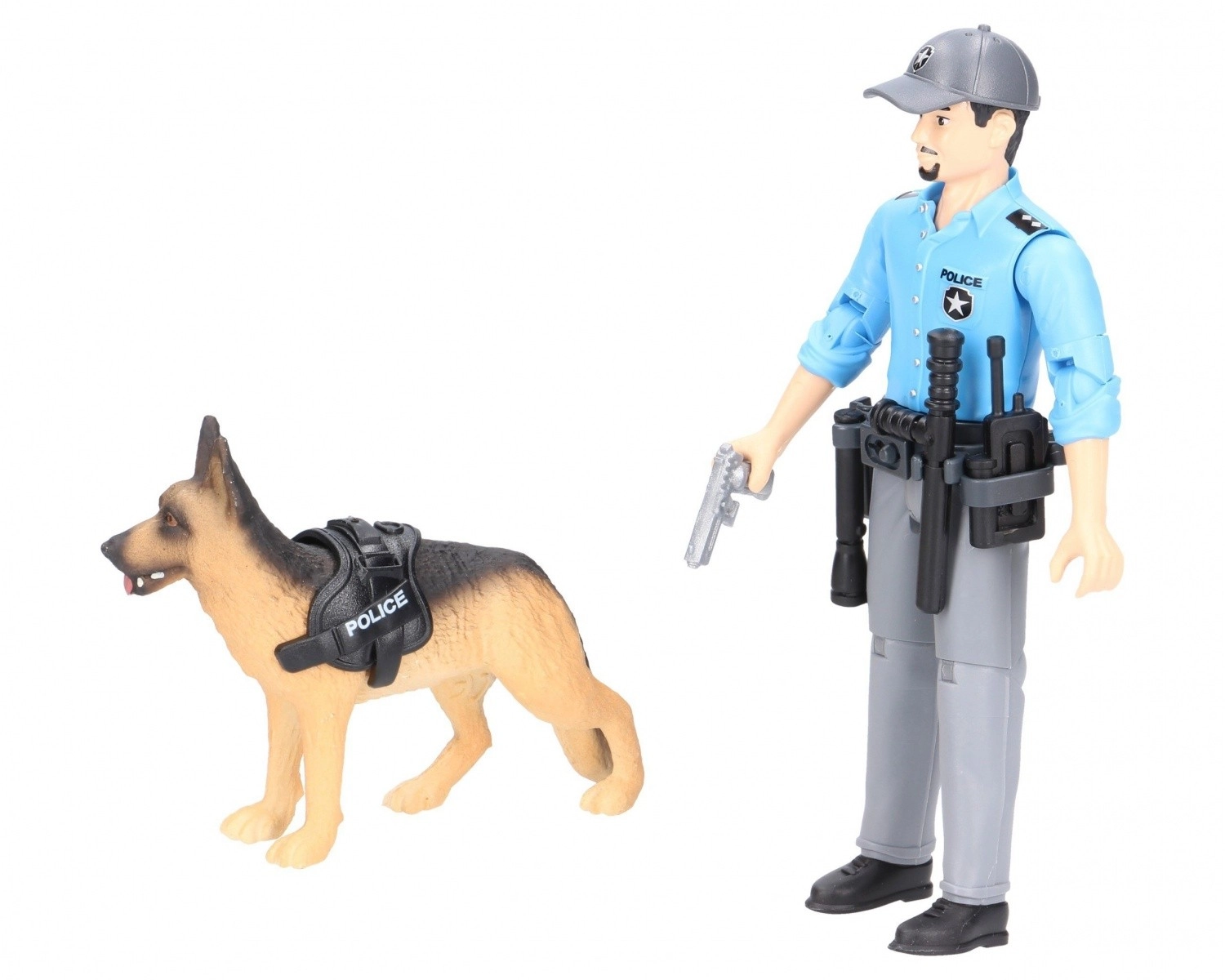 - Figura de policía, figura de pastor alemán, walkie-talkie, esposas, pistola, porra, arnés/correa