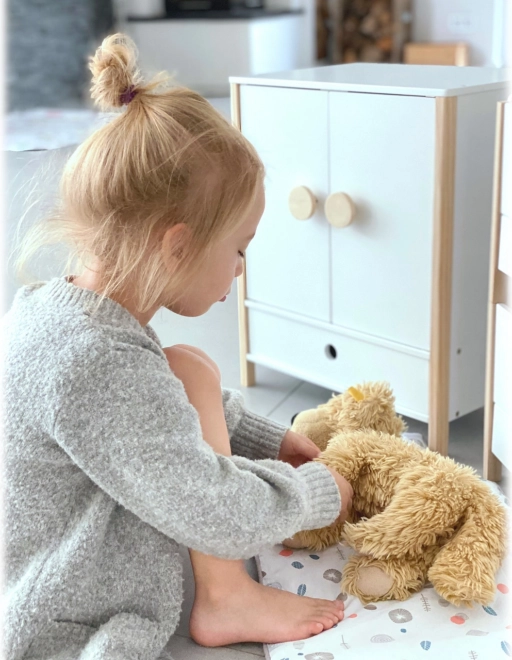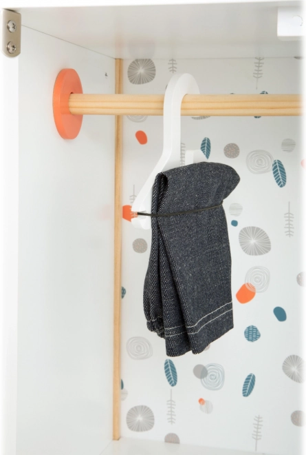 La estructura de madera resistente, el acabado estable y los bordes redondeados garantizan un juego cómodo y seguro. El armario fomenta la autonomía, el sentido del orden y desarrolla la imaginación durante el juego de cuidado de las muñecas.