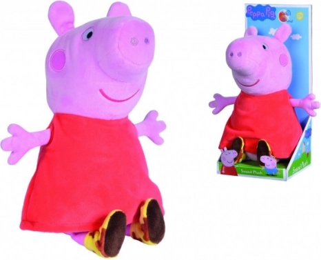 La querida protagonista de la serie Peppa Pig como amiga de peluche con sonido. Solo hay que presionar suavemente la barriga y Peppa emitirá sonidos divertidos que fomentan la alegría del juego y estimulan la imaginación infantil. El material suave es delicado con la piel de los niños e invita a abrazarla.