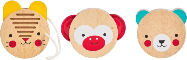 Tres sencillos instrumentos de percusión con motivos de animales fomentan la percepción natural del ritmo y la alegría por la música desde una edad temprana.