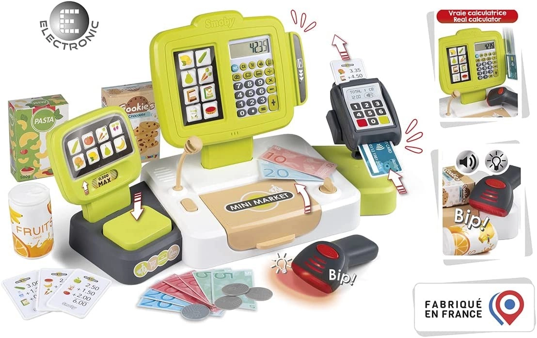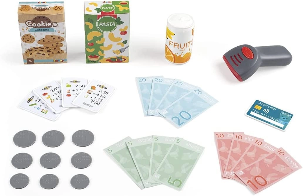 El juego desarrolla cálculo, motricidad fina y habilidades sociales y, gracias al completo set de accesorios (macarrones, galletas, dinero, recibos, tarjeta de pago), cada compra es diferente. La alta calidad de SMOBY garantiza seguridad y durabilidad.