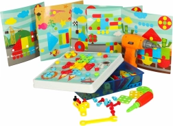 El set con tablero de mosaico permite a los niños, mediante el taladro de juguete, el destornillador y la llave, atornillar tornillos de colores y crear imágenes variadas y modelos tridimensionales. Da vida a la fantasía infantil: el único límite es la imaginación del pequeño constructor.