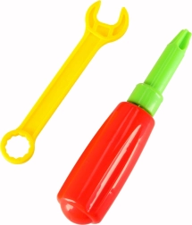 Los niños pueden atornillar como verdaderos manitas gracias al taladro a pilas seguro, el destornillador y la llave: ideal para entrenar la motricidad.