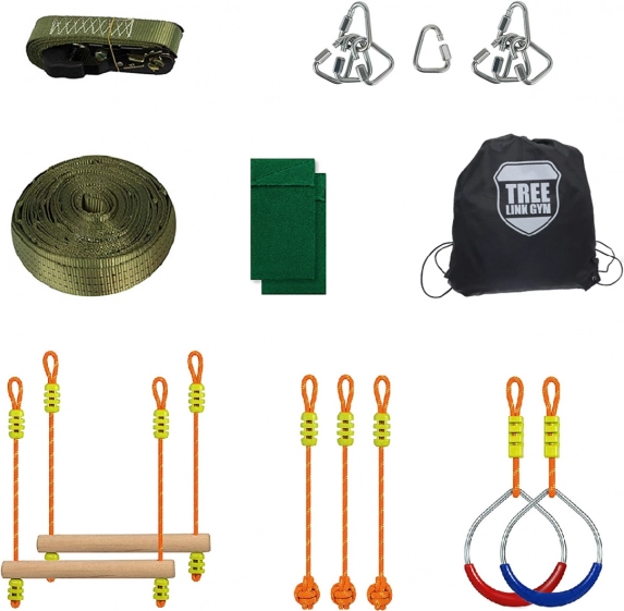 La pista de obstáculos Ninja 2Kids Toys está construida sobre una resistente cinta de nailon, que puede tensarse entre dos árboles mediante un robusto trinquete metálico. En la cinta se pueden colgar diferentes tipos de obstáculos que se fijan con mosquetones. Esta variabilidad permite alcanzar distintos niveles de dificultad y garantiza un entrenamiento divertido para cualquiera. Además, la pista también se puede usar como slackline.