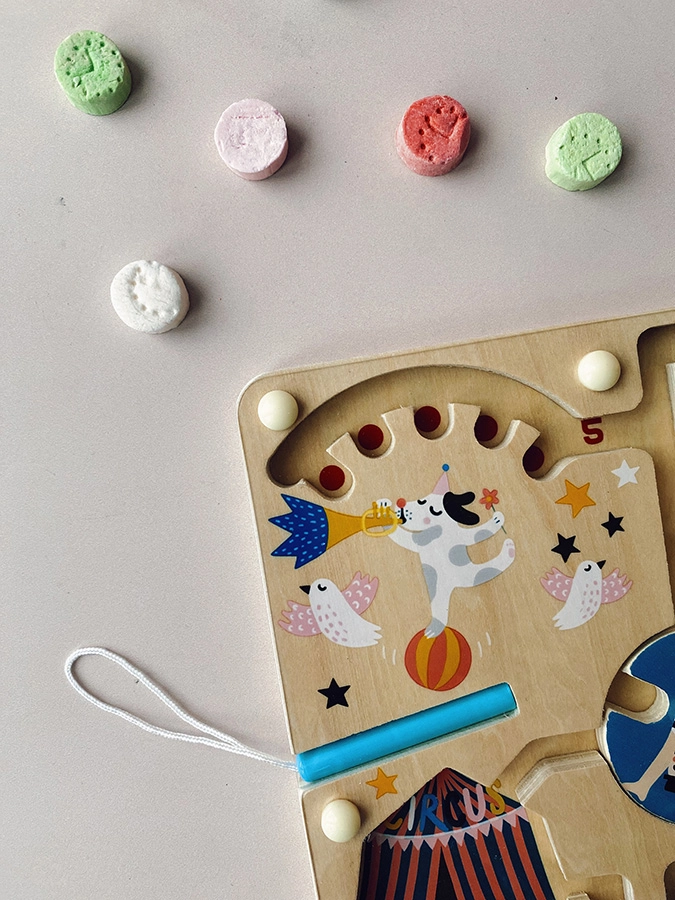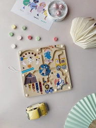 El laberinto magnético VILAC introduce a los niños a partir de 2 años en el mundo del circo con los suaves colores de Michelle Carlslund. Con el lápiz magnético desplazan las bolitas por los recorridos, se encuentran con acróbatas, animales y payasos y, al final, devuelven cada bolita a su lugar correcto según el color y el número. El juego fomenta de manera natural la concentración y la paciencia.