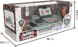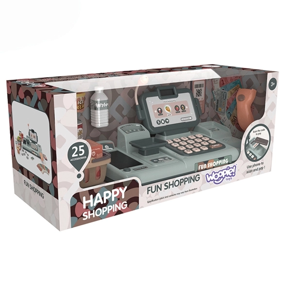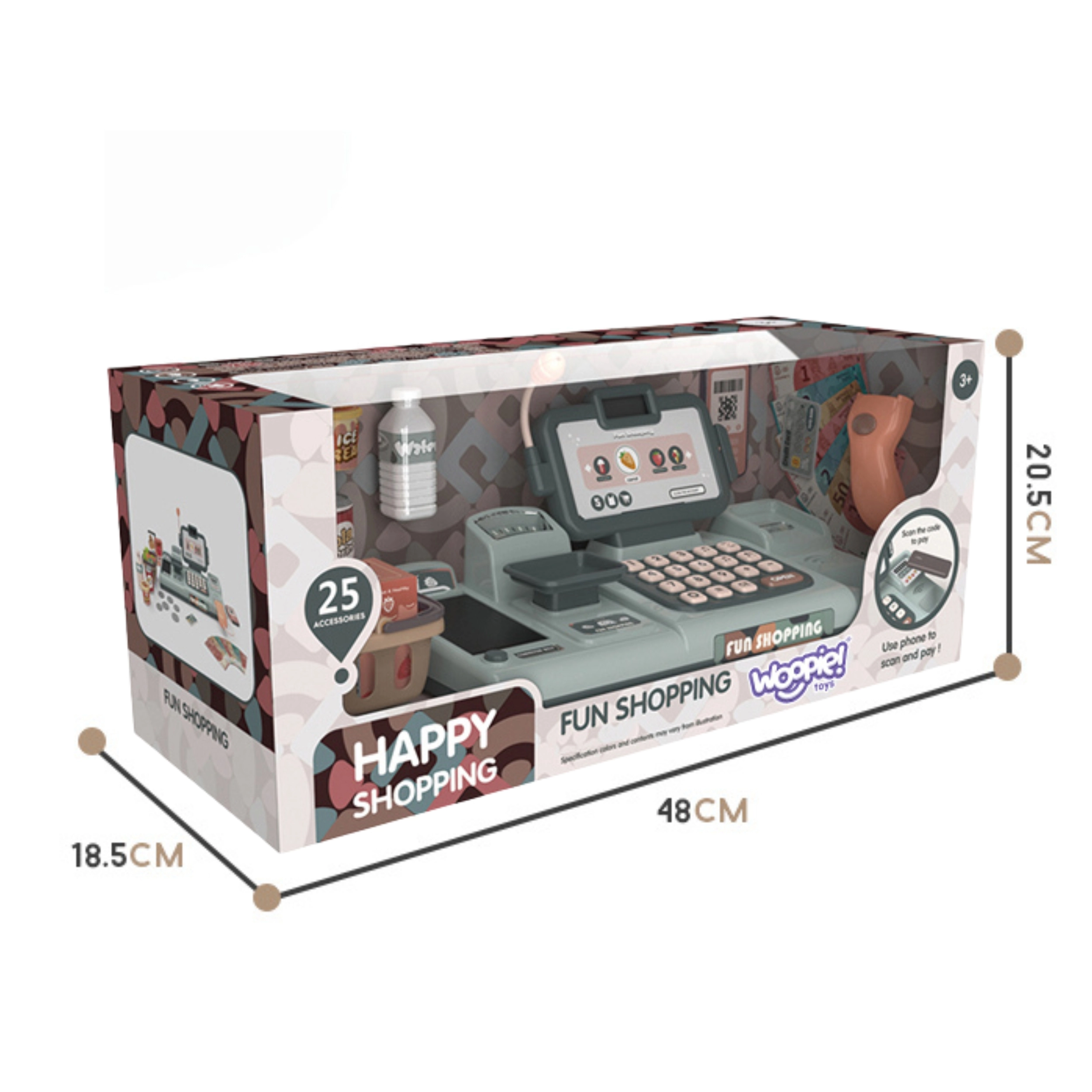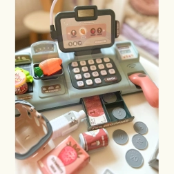 La caja registradora infantil Woopie es imprescindible para cualquier pequeño comerciante. Está equipada con una calculadora con pantalla LCD, donde se muestran las cifras, y también con un lector con sonido de productos, que ofrece una experiencia de compra realista.