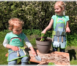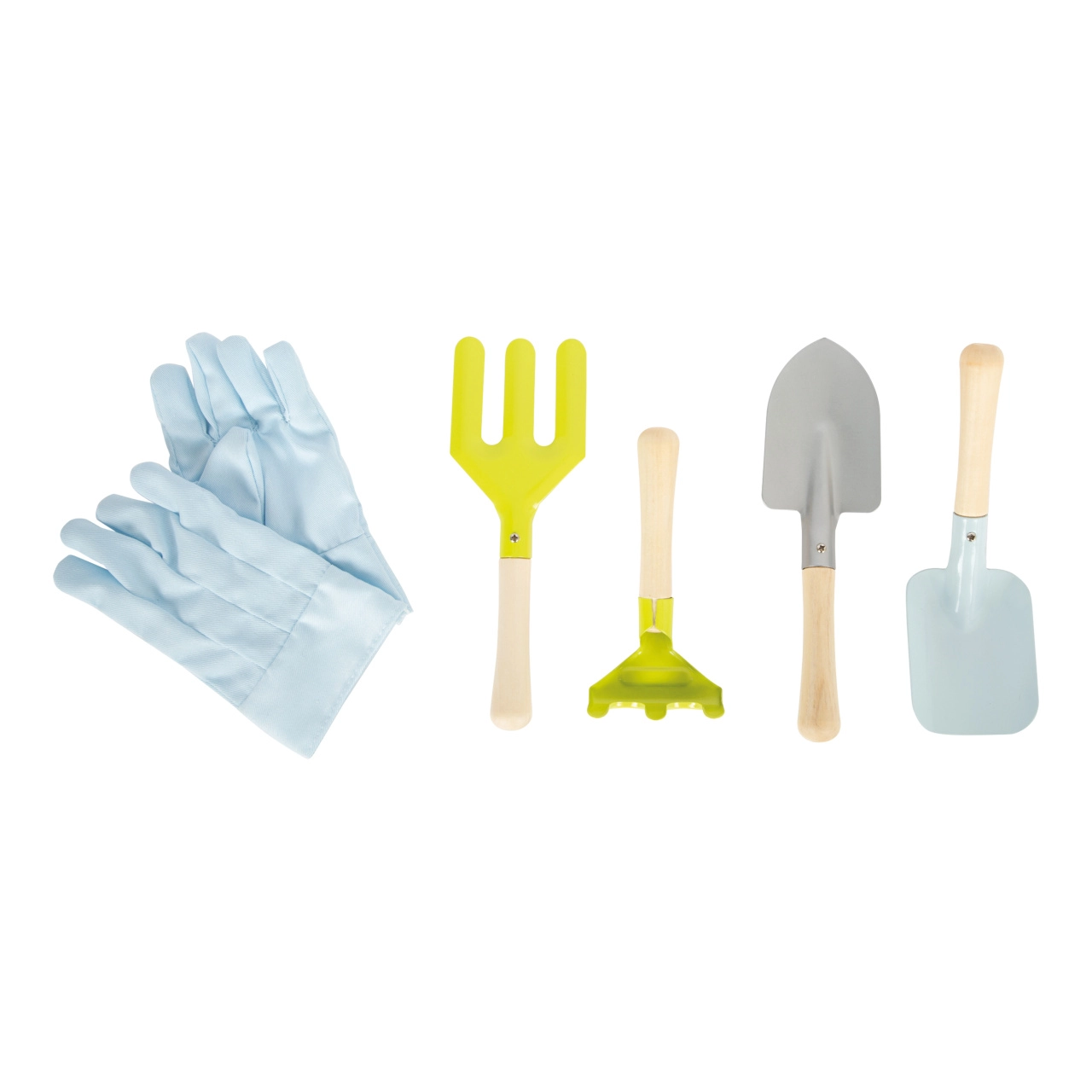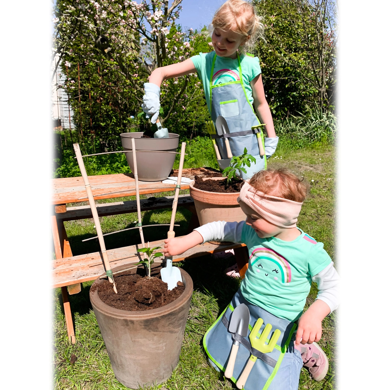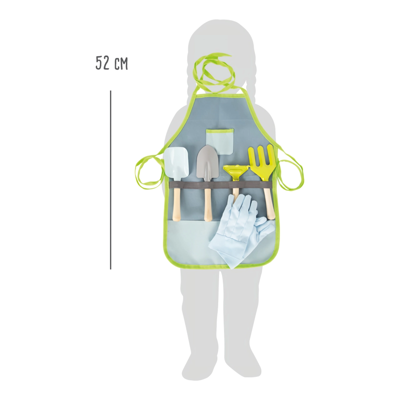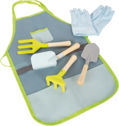 Práctico set infantil para pequeños jardineros que incluye delantal con bolsillos, guantes y cuatro herramientas: pala, rastrillo, palita y horquilla. Las herramientas de metal robusto con mangos de madera se adaptan perfectamente a las manos infantiles, mientras que el delantal con bolsillos y los guantes protegen la ropa y las manos. Ideal para jugar y también para ayudar de verdad en el jardín, y útil también en la cocina o para manualidades.