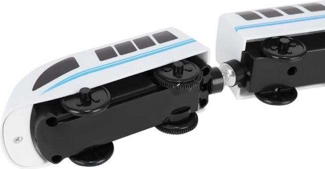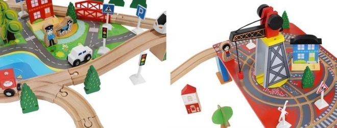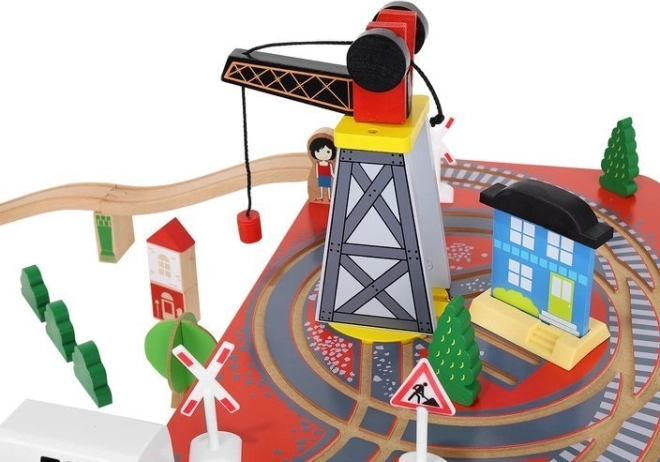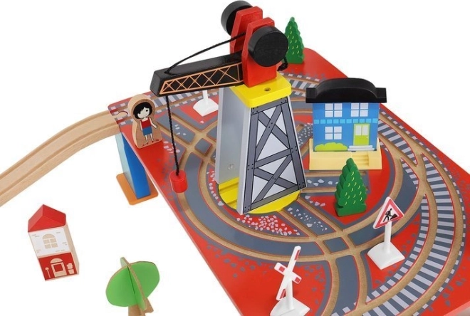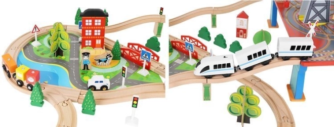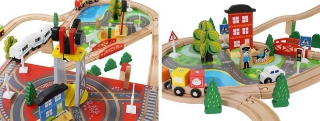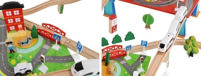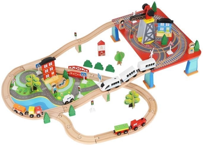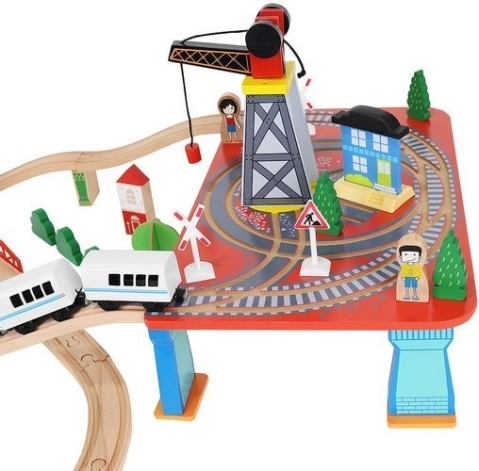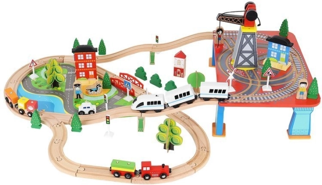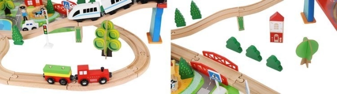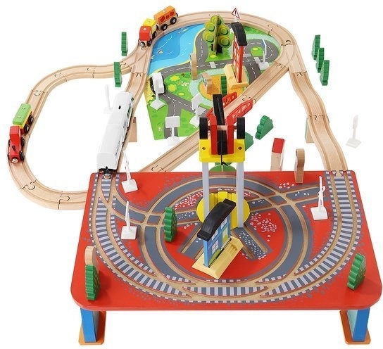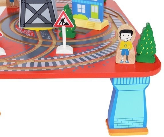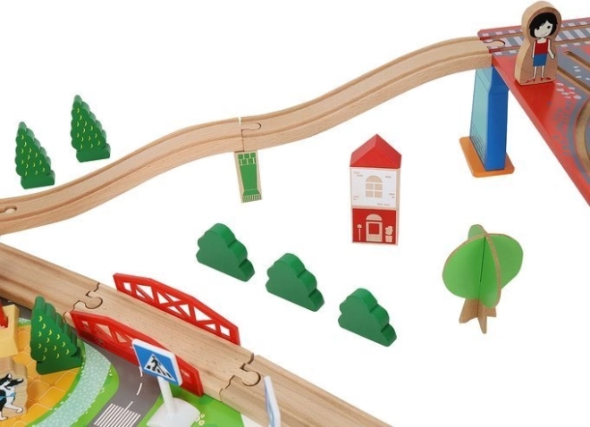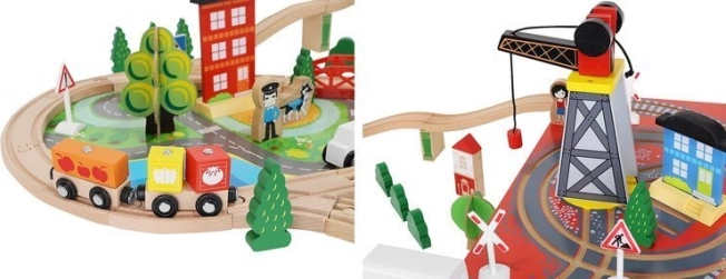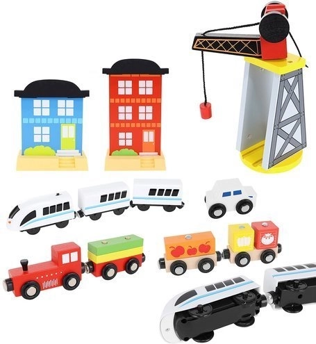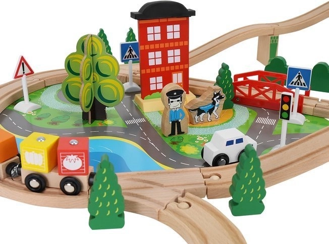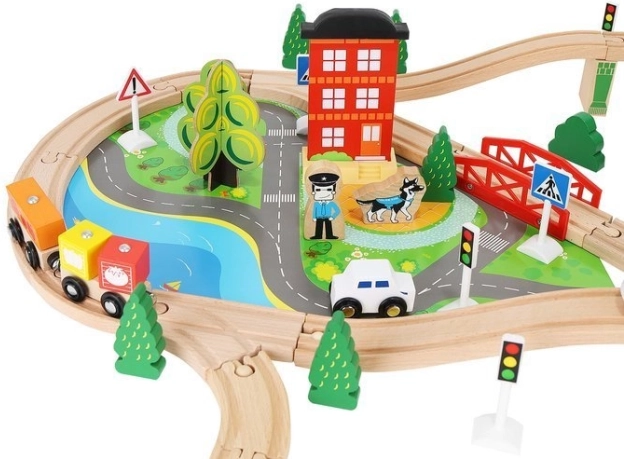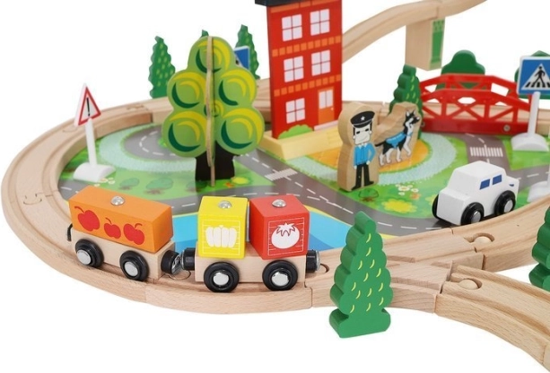 Vía de tren de madera con un total de 88 elementos fabricados con precisión, incluyendo vías, tren de carga y tren de pasajeros, coche, arbolitos y señales de tráfico. La diversión reside en la posibilidad de crear tu propia ruta, mientras que la unión magnética de las piezas garantiza un manejo sencillo.