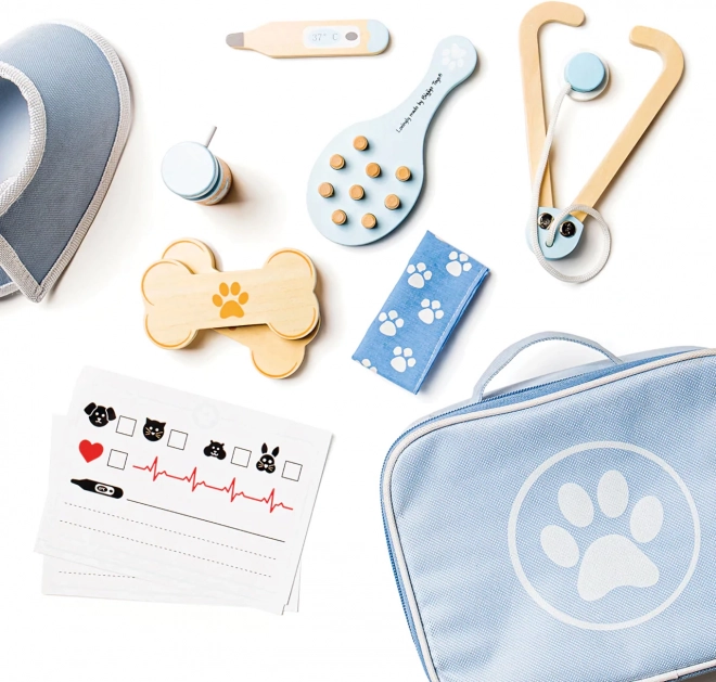 El maletín veterinario completo permite a los niños cuidar de peluches y figuras de mascotas como verdaderos doctores. El set incluye herramientas como estetoscopio, termómetro, otoscopio, jeringa, vendaje, cepillo, collar isabelino y otros accesorios. Todo está guardado en un resistente maletín textil con una huella de pata, ideal para transportar y almacenar.