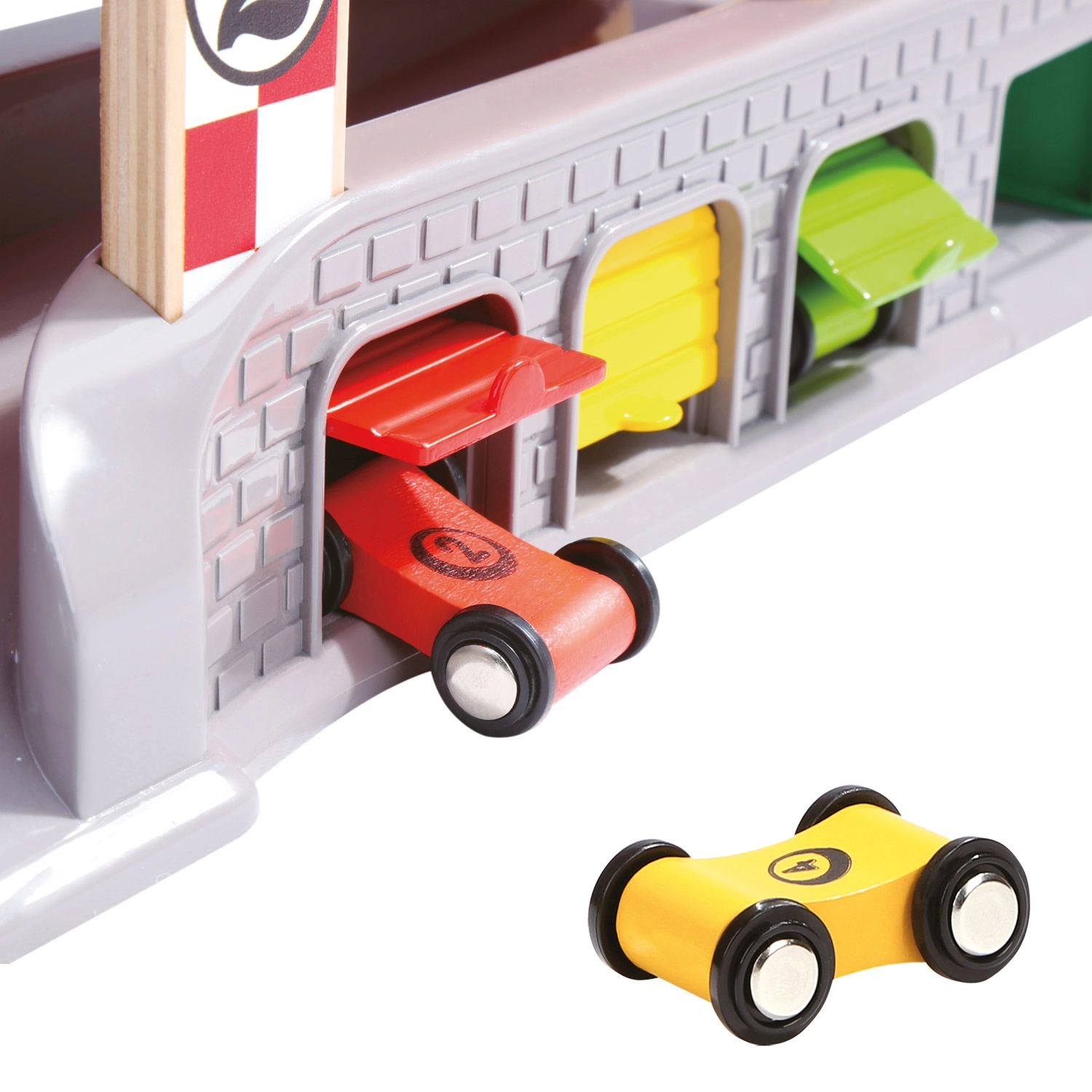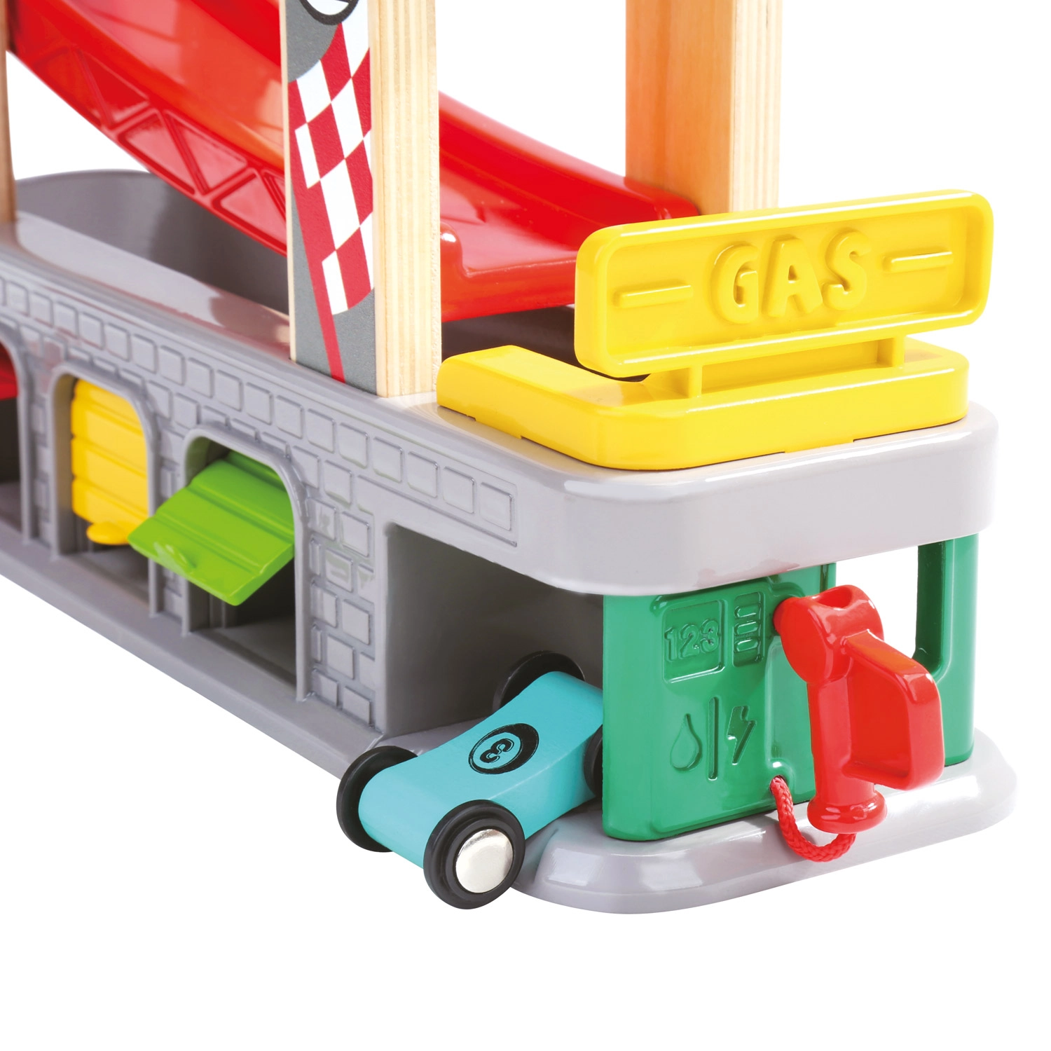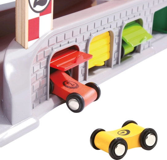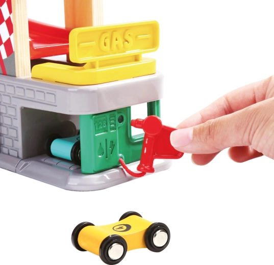Tres garajes con puertas abatibles y una estación de repostaje fomentan escenarios imaginativos: desde paradas de mantenimiento hasta aparcamiento y clasificación de coches.