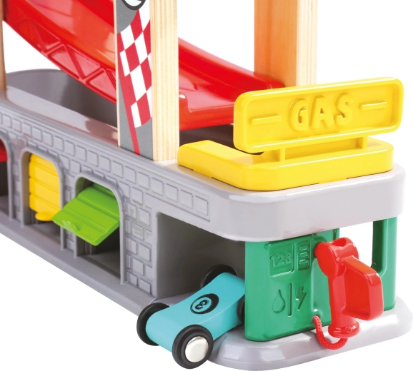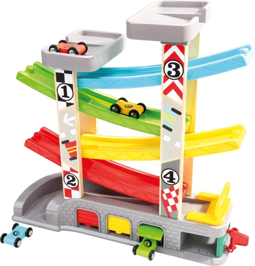 La construcción estable con materiales resistentes soporta el juego diario, mientras que los prácticos garajes también sirven para guardar y transportar los cochecitos. Los colores vivos y los niveles numerados ayudan a reconocer colores y a iniciarse en el conteo básico. El paquete incluye cuatro cochecitos de desplazamiento suave para competir al instante.