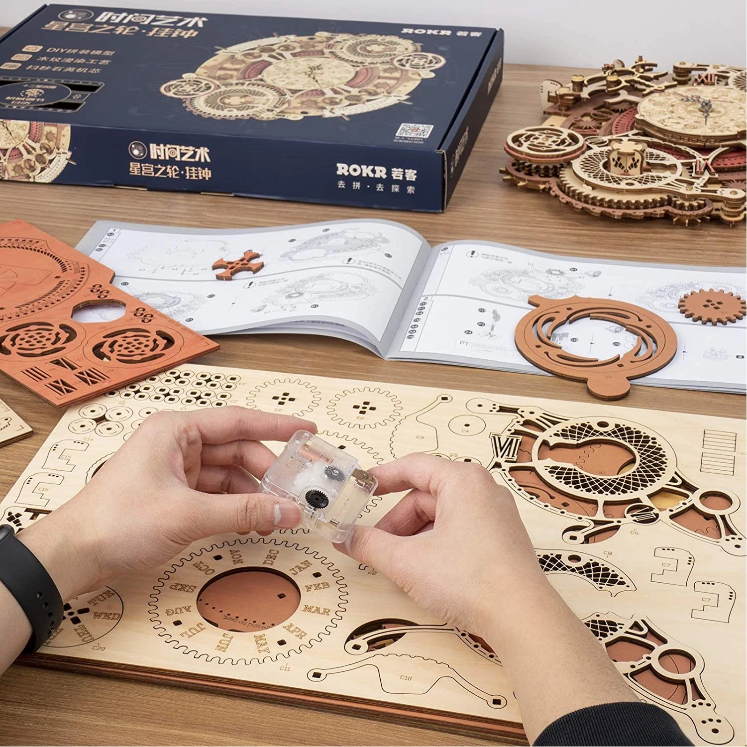 El calendario muestra los meses y los días mediante mandos giratorios, lo que aporta un toque de diseño moderno a tu hogar u oficina. Todo el modelo está destinado al montaje, ofreciendo así una experiencia satisfactoria de fabricación propia.