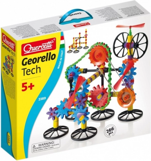 El set Georello Tech transmite el movimiento rotatorio entre engranajes distantes y muestra de forma clara las funciones mecánicas básicas similares a las que se encuentran en máquinas reales. Gracias a la cadena y a la correa elástica, los niños conectarán engranajes a mayores distancias y crearán construcciones aún más complejas.