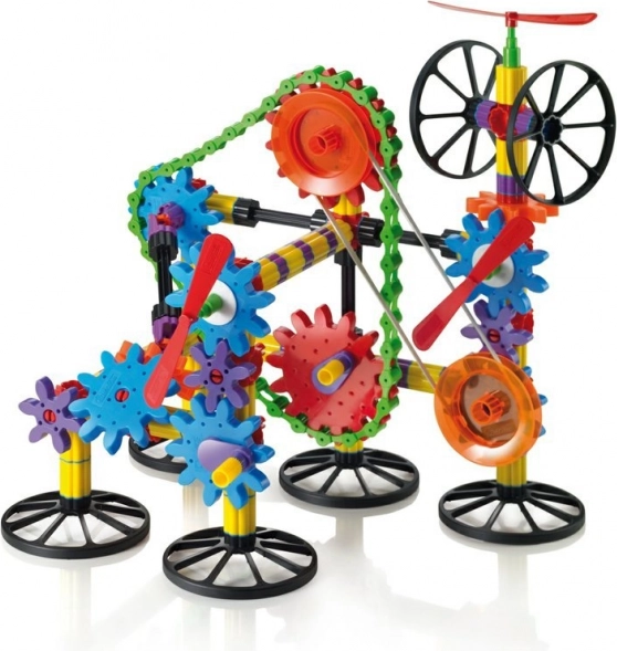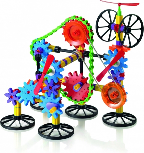 Conecta los engranajes, la cadena y la correa elástica y observa cómo se transmite el movimiento rotatorio incluso a lugares alejados. Una excelente introducción al mundo de la técnica.