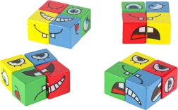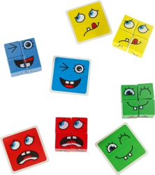 Cubos suavemente pulidos con impresión de ojos y bocas que permiten componer decenas de expresiones. Resistentes, seguros y agradables al tacto.