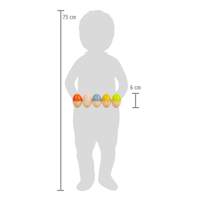 Los huevos combinan madera maciza natural con colores modernos y un acabado de superficie resistente. Son excelentes para el juego individual y en grupo, favorecen la ritmización, la coordinación mano-ojo y la motricidad fina. Gracias a su versatilidad, son adecuados para el hogar, guarderías y talleres de música.