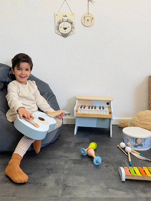 El tambor infantil Groovy Beats de small foot está diseñado para motivar a los pequeños músicos a descubrir el ritmo de forma divertida y natural. La combinación de madera natural y colores modernos en contraste, complementada con un juguetón motivo de conejo, lo convierte en un juguete musical atractivo y resistente.