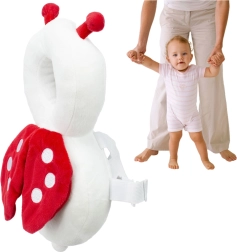 Suave mochila protectora con forma de mariquita que protege la cabeza del bebé durante sus primeros intentos de ponerse de pie, gatear y caminar. Correas elásticas ajustables mantienen el cojín firme en la espalda, mientras que el cuello circular alrededor de la cabeza amortigua las caídas sobre la nuca. Ligera, suave y agradable al tacto para el uso diario.