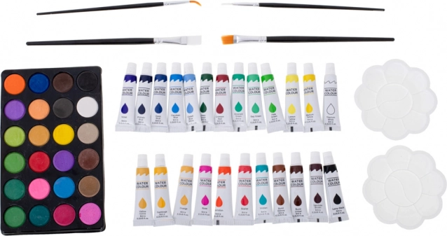 Paleta con 24 acuarelas, 24 pinturas en tubo, pinceles y dos paletas de plástico: equipamiento completo para técnicas al agua y cubrientes.