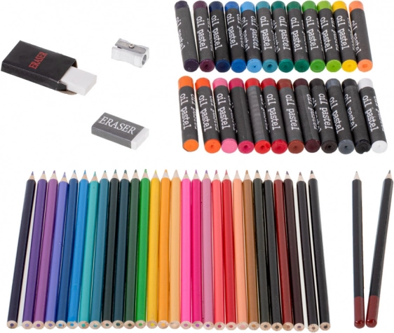 - 33× rotulador, 28× lápiz de color, 4× pincel, 2× lápiz de grafito, 2× goma, 2× paleta de plástico, 1× sacapuntas, 24× acuarela (paleta), 24× pintura en tubo, 24× pastel al óleo, 1× maletín