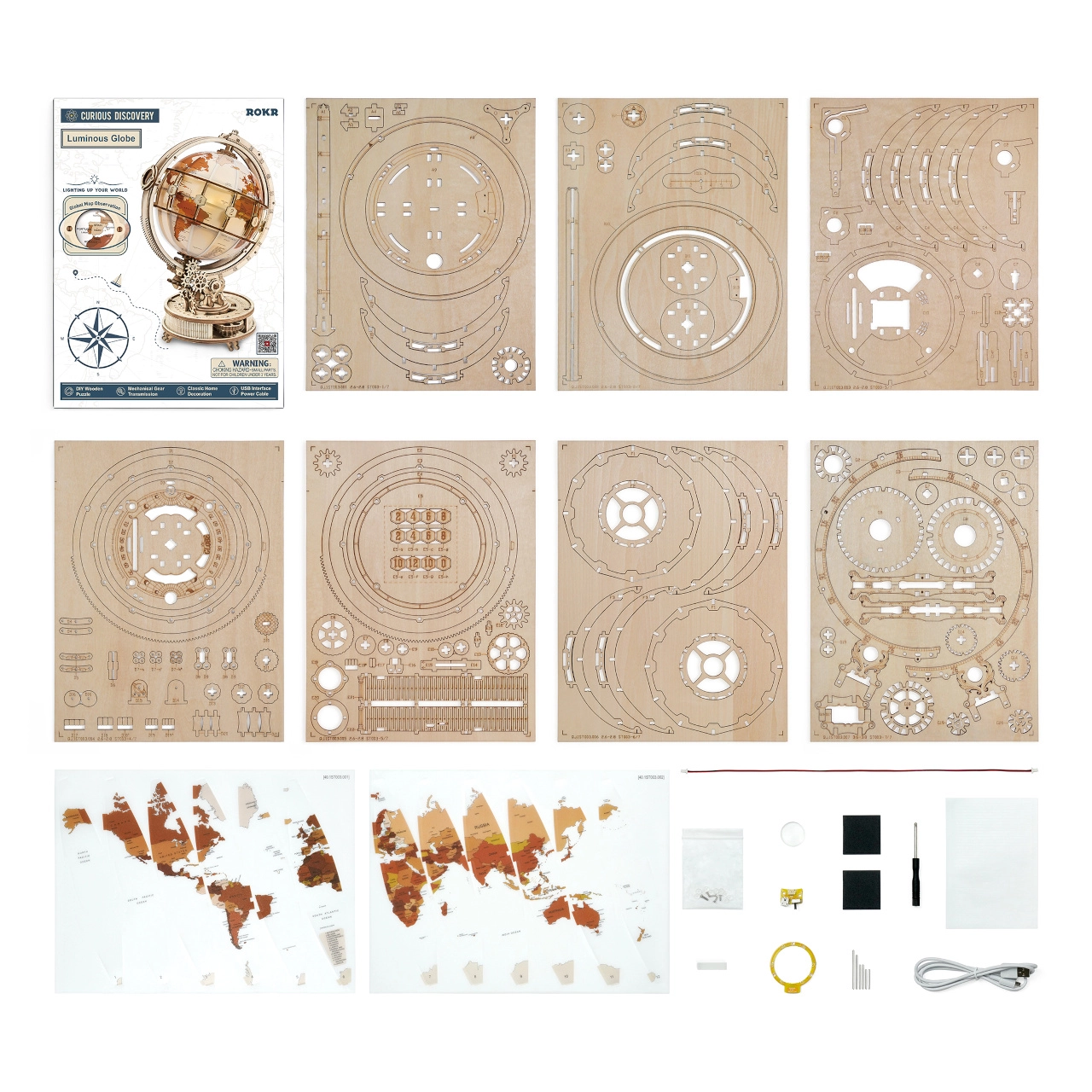 - Piezas de contrachapado cortadas, elementos del mapa, módulo LED, cable USB, manual