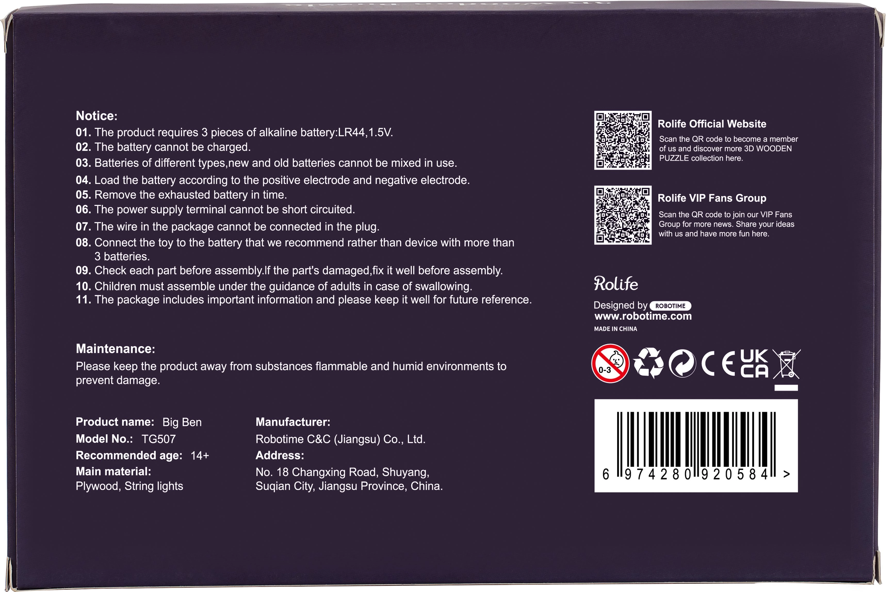 El conjunto LED integrado ilumina las ventanas del modelo y realza los detalles de la famosa torre del reloj. Alimentación segura mediante pilas de botón 3 × LR44 (no incluidas).