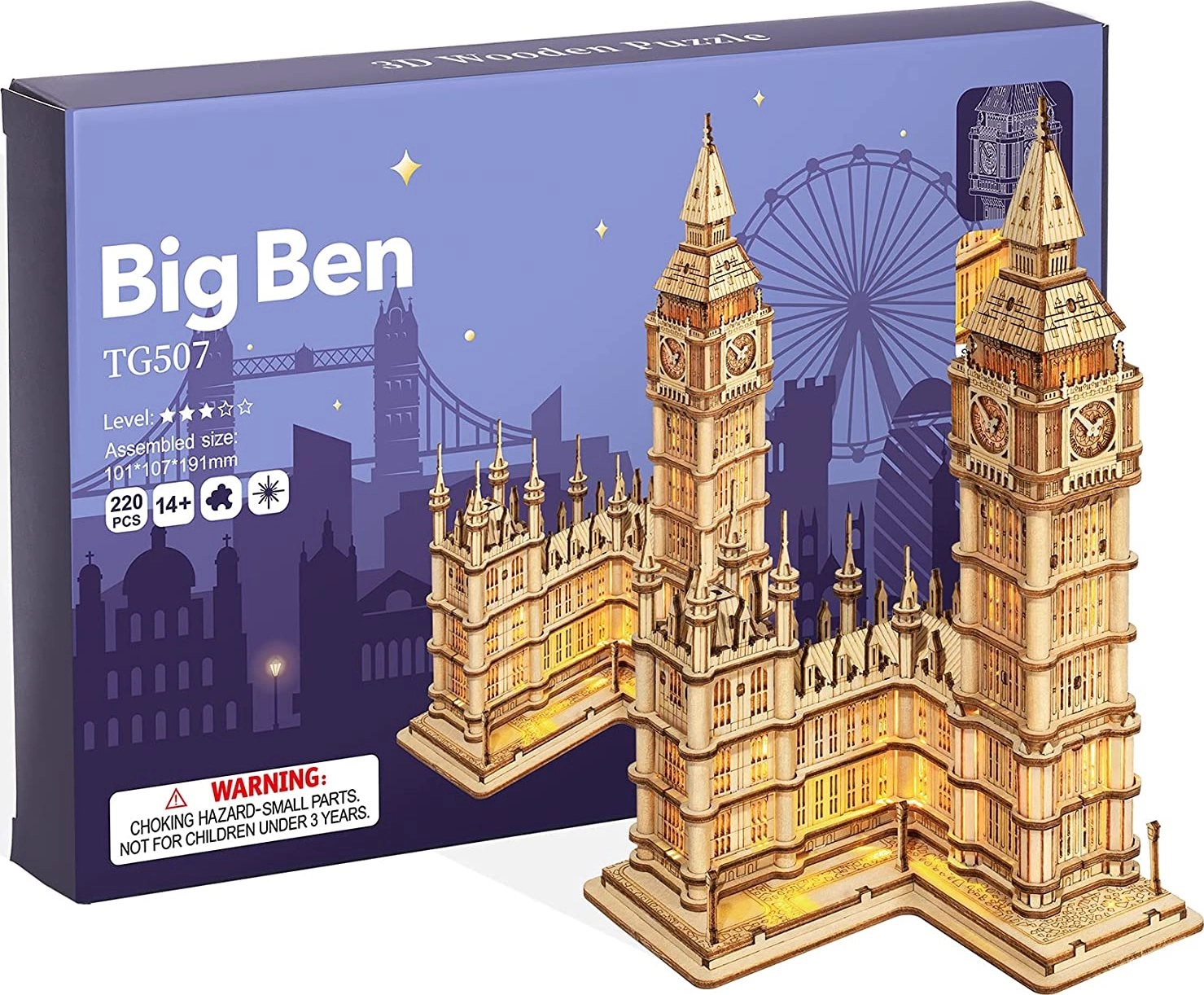 Descubre el encanto de la arquitectura histórica con el rompecabezas 3D de madera Big Ben. Gracias a sus detalles finos, uniones precisas y el conjunto LED integrado, surge una miniatura impactante de la famosa torre londinense que, al encenderse, evoca la atmósfera de la ciudad por la noche. El kit es una gran elección para aficionados hábiles a partir de 14 años y también como decoración representativa para el despacho, el salón o una vitrina.