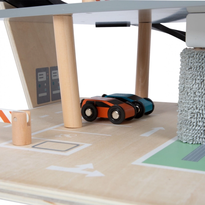 Este aparcamiento de carreras de madera con diseño moderno ofrece a los niños un mundo de juego ricamente equipado. Los tres niveles están conectados por un ascensor funcional y dos rampas suaves que permiten un movimiento fluido de los cochecitos. Cada nivel cuenta con una barrera mecánica y un vallado de goma que aumentan la dinámica y evitan que los vehículos se salgan. Los iconos de colores y la señalización vial favorecen el aprendizaje a través del juego y desarrollan la imaginación.