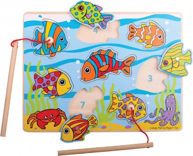 Divertido juego de madera para los más pequeños, donde los niños usan una caña magnética para pescar pececitos de colores y devolverlos a los orificios correctos. Fomenta la motricidad fina, la coordinación ojo–mano y la concentración. Fabricado en madera de calidad de fuentes responsables, cumple con las normas europeas de seguridad. El paquete incluye 10 piezas.