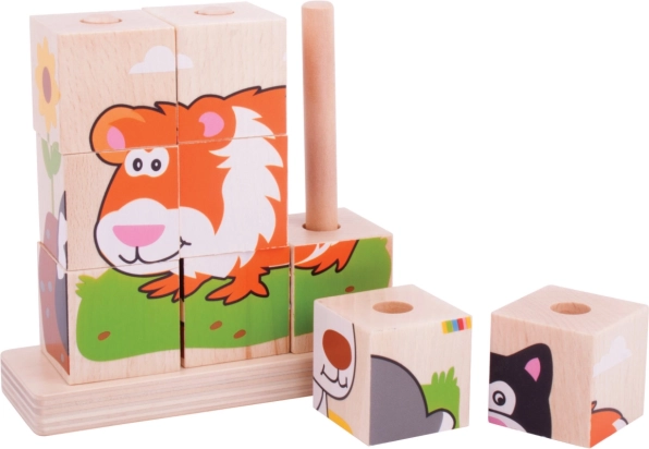 Los cubos encajables de madera Bigjigs Baby son una opción ideal para los primeros rompecabezas y construcciones. Los niños practican el agarre, la destreza de los dedos y la percepción visual al buscar las caras correctas de los cubos y encajarlas en los pernos. Las ilustraciones coloridas de animalitos motivan a jugar repetidamente y favorecen la concentración.