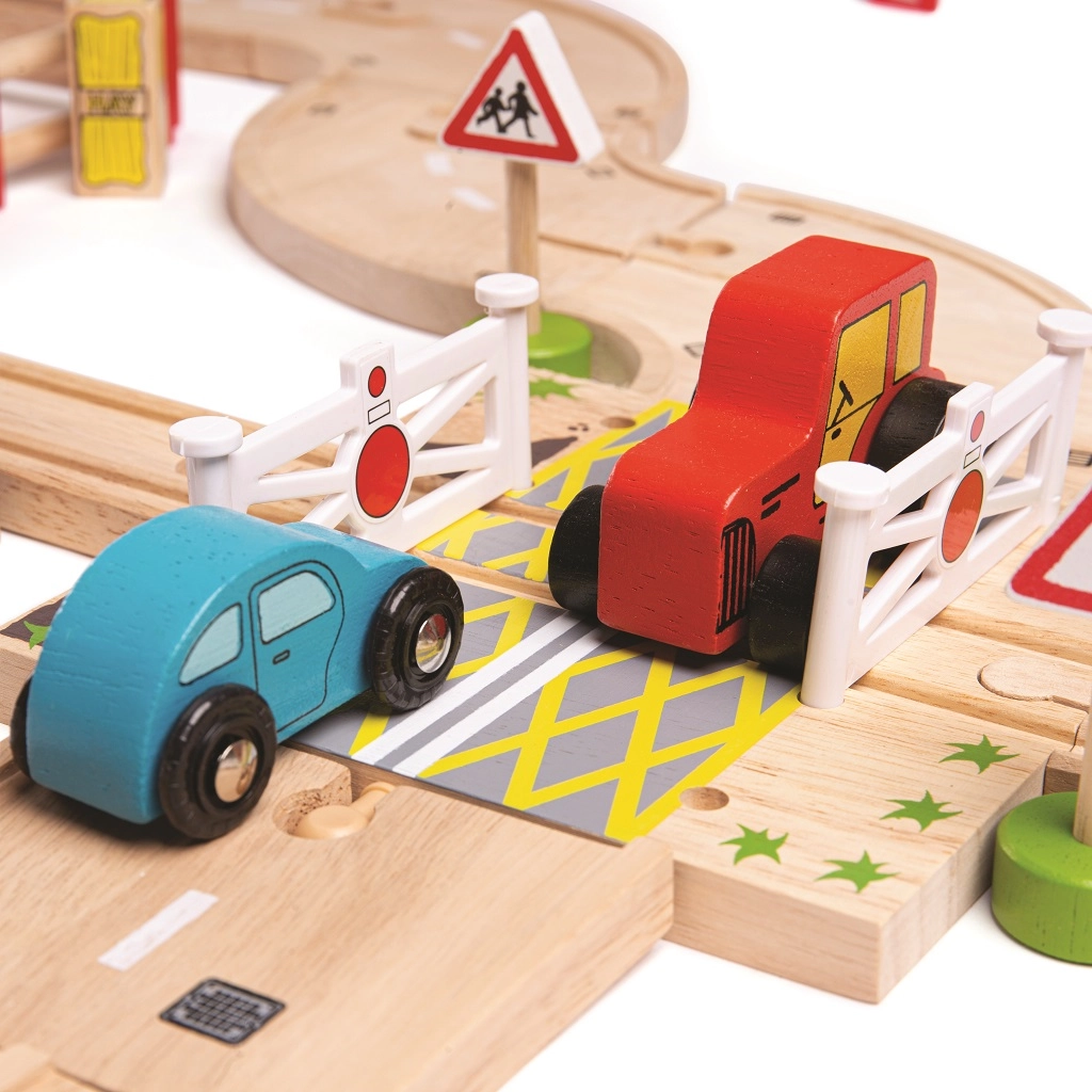Este ferrocarril de madera con camino rural es la combinación perfecta de ferrocarril y pista de coches, que imitan el mundo real del transporte. Gracias a los puentes y pasos a nivel, tus hijos se adentrarán en un mundo lleno de aventuras divertidas. Todo se complementa con accesorios locales como una granja, edificios y árboles, que embellecen el entorno.